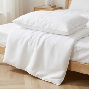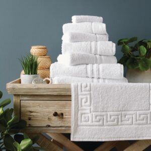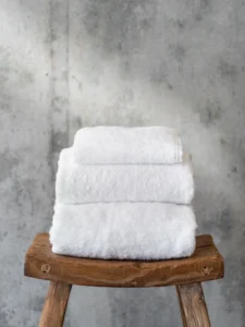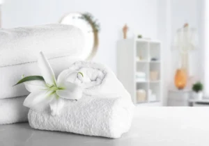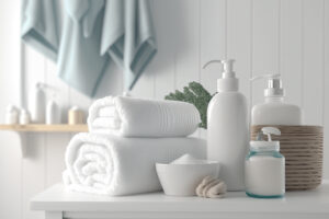 Spa, bathroom background. Towels on white desk near white wall and interior accessories with copy space. Neutral white colors. Ai generative